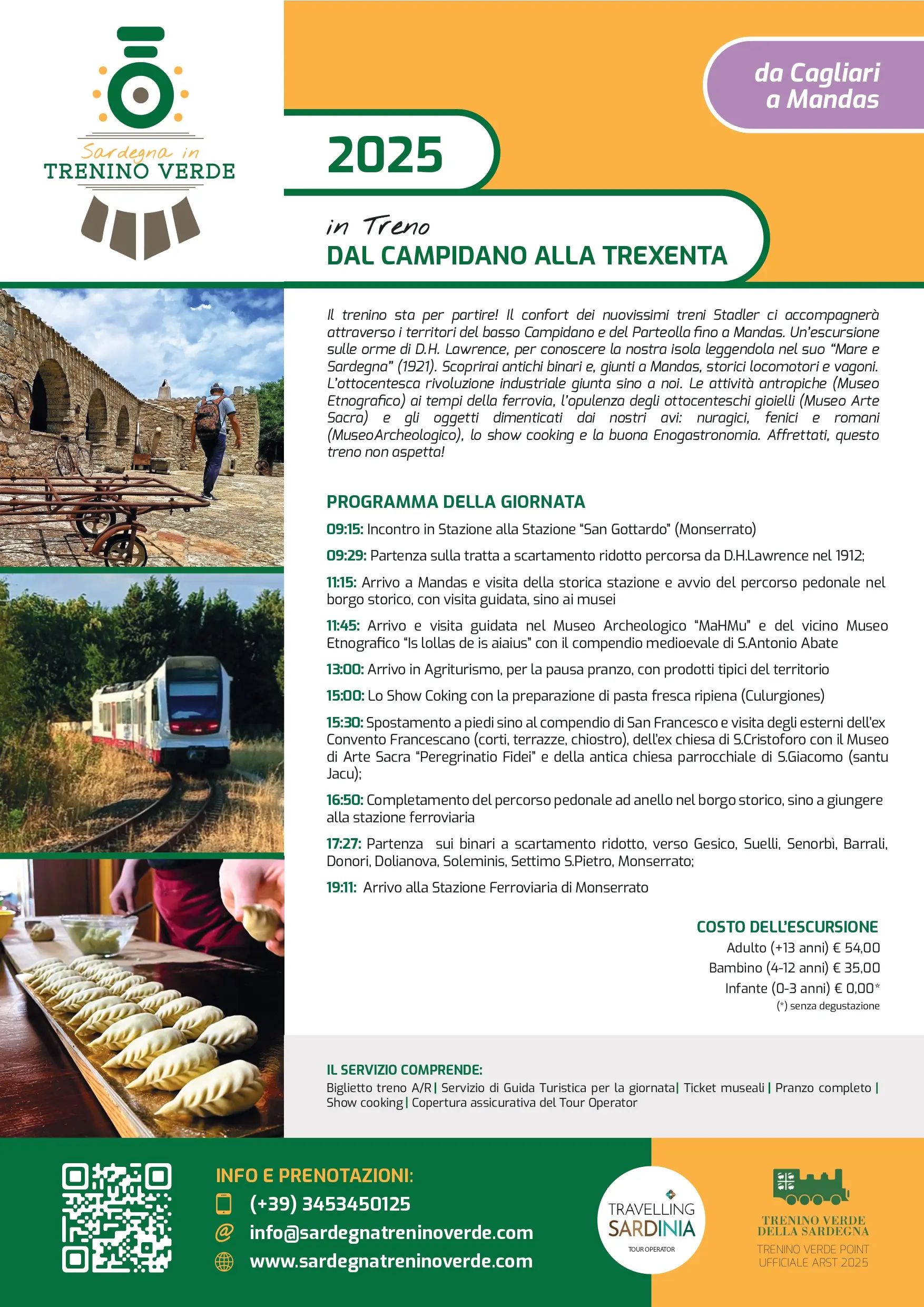 - Servizi Guida IT/EN per l’intera durata della giornata (Trenino Verde, Stazione Ferroviaria, Percorso pedonale Mandas, Convento S.Francesco e Chiesa S.Giacomo);